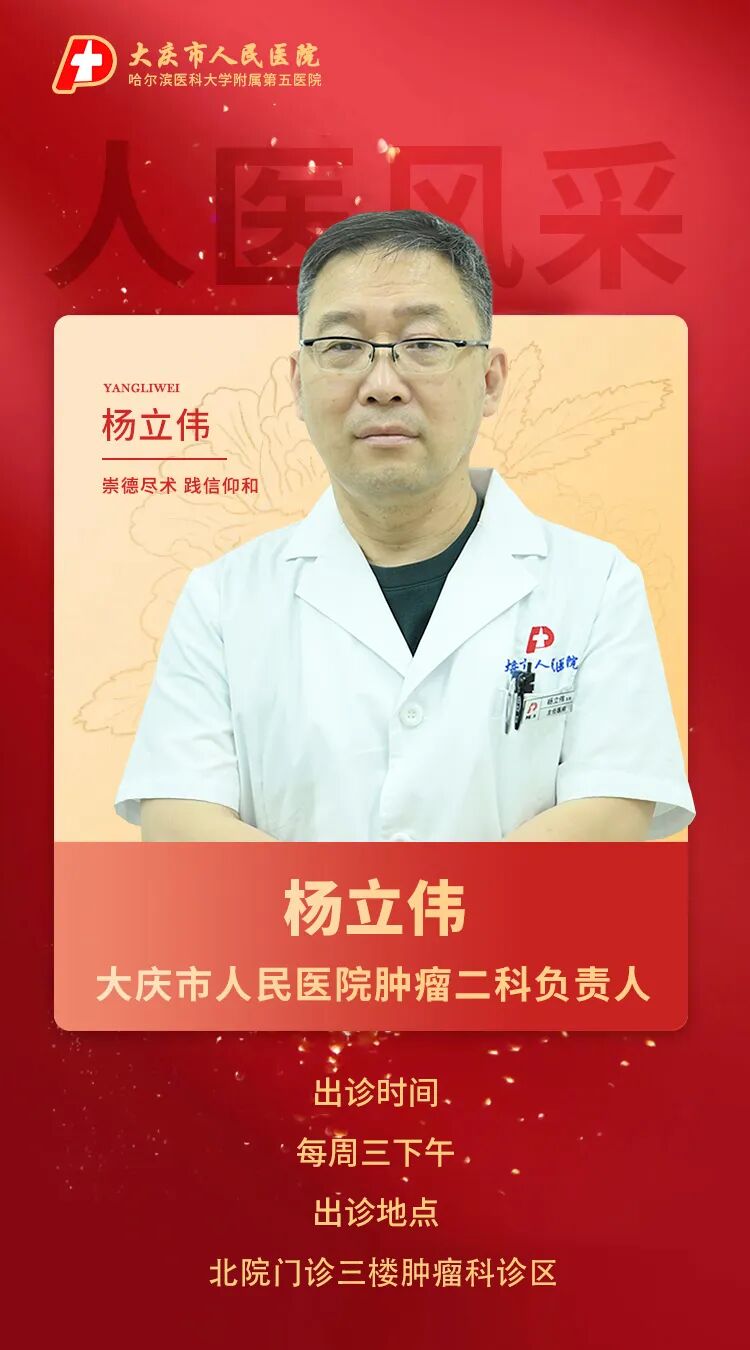 杨立伟,原大庆市第二医院肿瘤科主任,现任大庆市人民医院肿瘤二科负责人,主任医师,医学硕士。担任中国医疗保健国际交流促进会消化道肿瘤多学科分会委员会、中国抗癌协会青委会、北京医学会淋巴瘤分会、黑龙江省抗癌协会、黑龙江省医学会呼吸肿瘤专业科联盟成员、黑龙江省抗癌协会消化道肿瘤多学科委员会、黑龙江省医疗保健促进会精准医疗专业委员会、大庆市医学会肿瘤分会等协会委员。